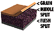 The smooth outer layer, or grain side, is used for better gloves where "look" and dexterity are important. The bottom layer, the flesh split or suede, is used mostly in leather palm styles, most of which have linings to protect the hands against its roughness. We don't use the middle split because it has no tensile strength. |